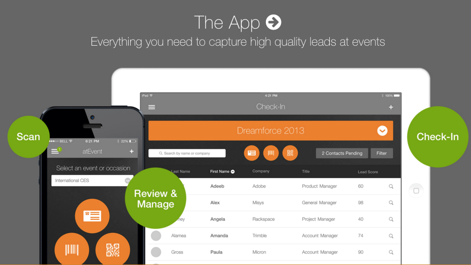 2. AtEvent - the AtEvent app helps you to capture higher quality leads that can be nurtured or routed to sales for immediate follow up. The app can scan attendee's business cards or badges to accurately capture prospect contact info, add topics and follow-ups and check-in attendees. It also enables you to review and manage any information collected and it can integrate seamlessly with most Marketing Automation and CRM systems.
